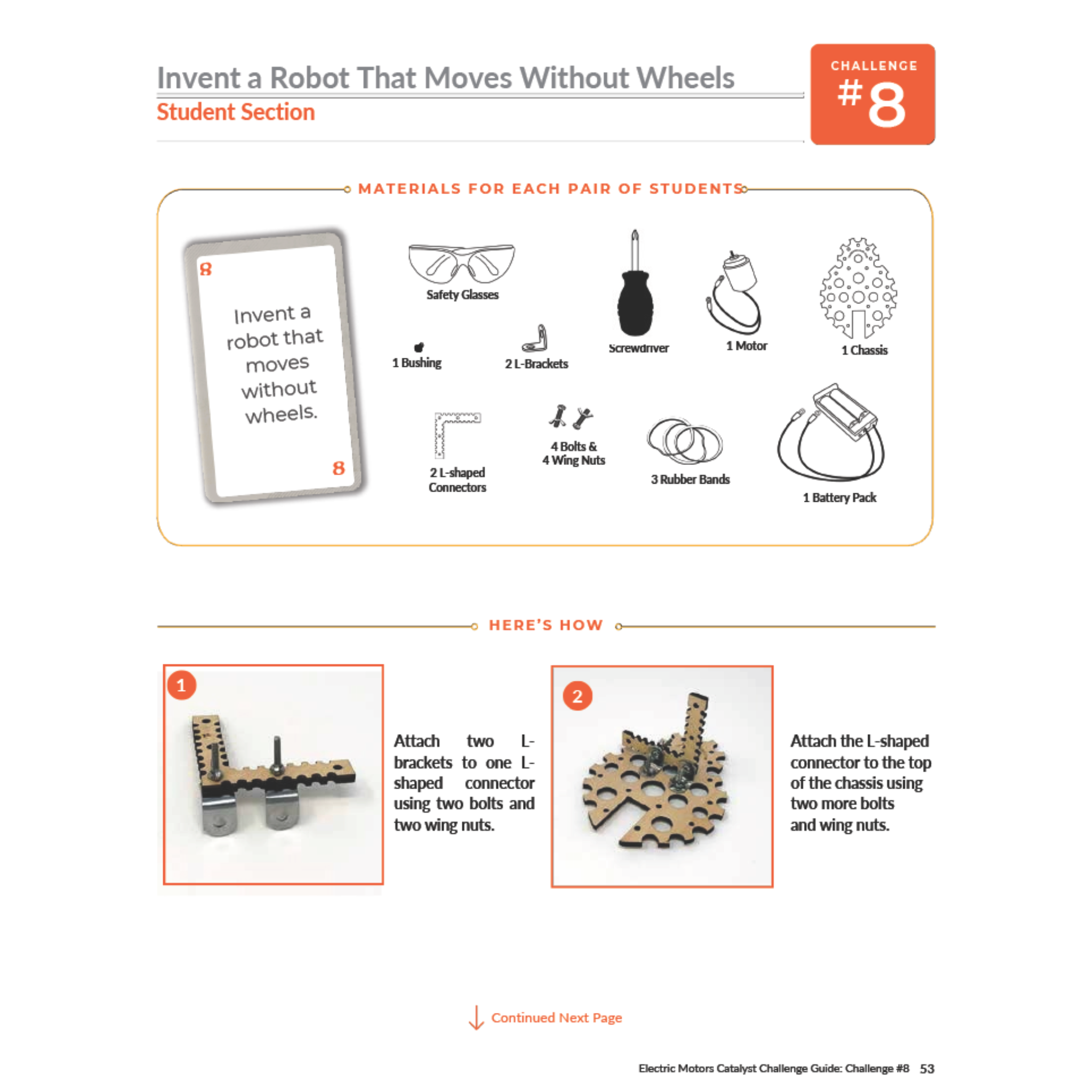The Catalyst Kit engages students in engineering using real materials—like wood parts, screws, wingnuts, and L-brackets—paired with motors and battery packs to create working circuits. Students quickly see how everyday hardware connects to scientific principles, making abstract concepts tangible.